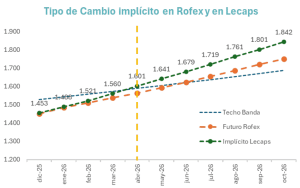 El mercado igualmente poco a poco va comprando el escenario de sostenimiento de las bandas cambiarias. Los contratos de futuros, ayudados por la baja de tasas, y el tipo de cambio implícito en las Lecaps empieza a dar cada vez más bajo.