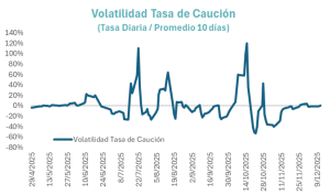 Con respecto al horizonte de inversión, la estacionalidad de diciembre por ahora juega en contra, pero es algo que se debería revertir naturalmente. Por el lado de la volatilidad de tasas de interés, post elecciones de octubre es algo que se ha ido logrando. Los niveles de volatilidad descendieron abruptamente. Eso se logró con el BCRA más activo y a una tasa conocida en la rueda de Simultáneas.