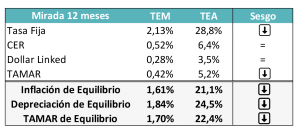 La inflación de equilibrio ya refleja esas cifras, y luego de haber operado en el rango del 26% para el año 2026, ahora ya se ubica más cerca del 21%. Empezamos a ver como los precios del mercado se empiezan a emparejar con las cifras que tienen proyectadas los principales analistas, que hablan de inflación más cercana a 20% que al 26% que llegó a pricear el mercado. La principal diferencia entre un momento y otro probablemente pase por la probabilidad cada vez menor que le asignan los inversores a cambios relevantes en el esquema de bandas cambiarias.
