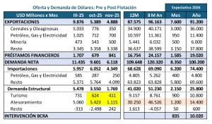 Si el BCRA quiere comprar aproximadamente el 5% del volumen operado en el mercado local (aproximadamente el 10% de la demanda neta), necesite que se genere un ingreso de divisas del orden de USD 1.500 / 1.600 millones mensuales por la línea de Préstamos Financiero. Luce como algo lograble si siguen creciendo los depósitos en dólares y si se mantiene el buen ritmo de colocaciones de deuda de empresas locales. Por lo tanto, vemos margen para que se de ese tipo de equilibrio en 2026.