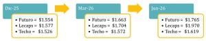 Si ponemos el foco en los cierres trimestrales como para entender dónde el mercado pricea más riesgos de movimientos cambiarios, vemos que en diciembre todavía es acotado y que recién para marzo y junio de 2026, con períodos más largos de incertidumbre y con una incidencia mucho más alta de la tasa de interés, vemos valores más dispersos con respecto al techo de la banda.