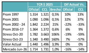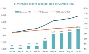 Si tomamos junio como referencia, el mercado espera entre 15 y 20 puntos de ganancia de tipo de cambio real. El análisis considera tanto la expectativa de tipo de cambio implícita en las Lecaps, como la inflación esperada y la inflación internacional.