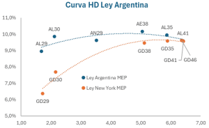 La semana pasada se hizo la emisión de deuda Hard dollar en el mercado local, con un resultado medido por volumen, que estuvo por debajo de las expectativas. Esta semana la noticia positiva que ayudó a que la curva HD comprima y que prácticamente todos los Globales operados en MEP estén en un dígito de TIR fue el anuncio de la decisión del BCRA de comenzar un proceso de acumulación de reservas. Era una noticia esperada por el mercado y que ayuda a aportar sostenibilidad a este tipo de instrumentos.