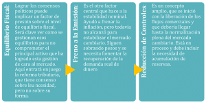 Evitar niveles altos de volatilidad: El último desafío es reducir la volatilidad del tipo de cambio, del valor de los activos y esencialmente de la tasa de interés. Es parte del proceso para recuperar la demanda real de dinero y volver a avanzar hacia la eliminación de los excesos de pesos.