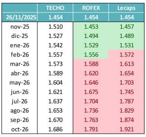 El Riesgo País, que había logrado fugazmente cruzar el piso de los 600 puntos básicos volvió al andarivel de 650 puntos. Junto con esa corrección de la curva hard dollar se dio también un aumento en los tipos de cambio implícitos en los contratos de futuros y en las letras a tasa fija. Hoy vuelven a operar por arriba del techo de la banda a partir d ellos contratos de marzo y de las letras con vencimiento en septiembre.