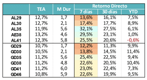 Las ganancias en todo el tramo HD fueron muy altas, pero las paridades (y el riesgo país), sieguen estando todavía por debajo de los niveles alcanzados en enero. Todavía hay margen para que siga comprimiendo.