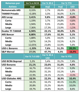 El gran ganador del mundo pesos fue sin duda el Merval (o todo el segmento de Renta Variable), que recuperó una parte importante del terreno perdido en el año. De todas maneras, sigue teniendo fuerte margen de recuperación hasta los máximos de enero.
