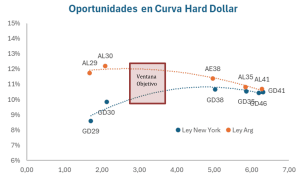 La ventana objetivo se ubica posiblemente en el rango de 3,2 a 3,6 años de duration. Dada la estructura actual de la deuda soberana hard dollar, esa parte de la curva estaba sin oferta. Es un rango intermedio en el que la Ley Local podría acercarse a la Ley Extranjera y con eso lograr salir a una tasa menor. Si el objetivo es lograr una TIR del orden de los 9/9,5 puntos, la paridad dada la estructura del bono debería rondar el 92%. Si se hace a niveles actuales de mercado, la TIR debería estar arriba del 10,5%. Por eso, se necesita una buena semana previa, eventualmente cambios normativos que alienten la demanda del bono o mucho interés de inversores puntuales para posicionarlo en niveles más altos de paridad.