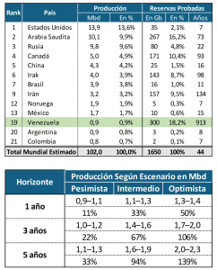 Reservas probadas: 300 mil millones de barriles (las mayores del mundo), 17% del total global. Producción de 0,9 Mbd.