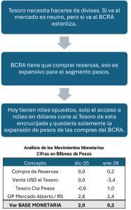En el caso del Tesoro el efecto depende de contra quien opere. Si va directo contra el BCRA, equivale a una venta de divisas del BCRA en el mercado, es decir que absorbe pesos. Si va al mercado es como un privado más, no tiene impacto. Operaciones como el pago de enero, quitan liquidez al mercado. Si en cambio lograra fondeo en dólares por arriba de los vencimientos, podría inyectar pesos.