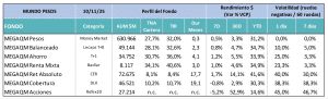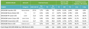 MEGAQM Corporativo USD: Es un fondo que se benefició del pequeño porcentaje de su cartera que estaba alocado en riesgo soberano (10% de la cartera) para gestionar la liquidez. Eso hizo que recupere terreno versus otras opciones HD. El 90% restante está alocado en emisiones privadas con un enfoque de duration más largo. Ese mix lleva la TIR de la cartera a niveles del 7,6%. Es una fondo para inversores con un horizonte de inversión largo, que buscan capturar en el tiempo ese devengamiento.