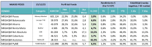 MEGAQM Corporativo USD: El segmento corporativo local sigue muy activo en emisiones y ha registrado muy buenos niveles de rendimiento en las últimas ruedas. Este fondo, con una estrategia larga de duration (42 meses) ya lleva una rentabilidad acumulada en el año del 6,06%. Es una opción muy atractiva para posiciones de inversión largas.