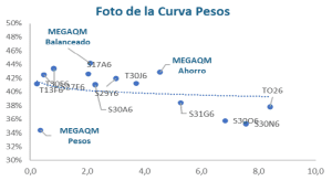 MEGAQM Retorno Absoluto: La curva CER sigue ofreciendo tasas reales altas, y ahora con una curva plana. Eso permite correr el fondo con una estrategia de duration media, que combina algunas posiciones cortas con otras más largas. Es una manera de lograr buen retorno real y tratar de bajarle la volatilidad. Un efecto compresión solamente se podría dar en escenarios en donde baje el riesgo país, por el arbitraje con la curva hard dollar.