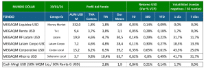 MEGAQM Corporativo USD: Un escalón arriba en rentabilidad y riesgo está este fondo que tiene activos corporativos locales. Apunta a aprovechar las nuevas emisiones y combinarlas con otras más maduras, pero manteniendo un posicionamiento en los mejores riesgos corporativos. Se ha ido bajando la posición en activos soberanos en la medida que el diferencial de rendimiento fue desapareciendo y que los activos corporativos ganaron en profundidad de mercado.