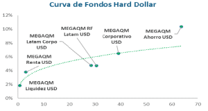 Las alternativas de inversión en fondos Hard Dollar se ordenan en una curva con pendiente claramente positiva. Las dos primeras opciones son de Cash Management y tienen el foco en devengamiento y baja volatilidad. En el tramo medio aparecen los fondos LATAM y en el tramo más largo los fondos con activos privados y soberanos locales.
