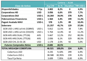 MEGAQM Corporativo USD: Dentro del abanico de opciones locales, este fondo se posiciona como la opción para el horizonte de inversión más largo. Invierte en obligaciones negociables hard dollar, con una duration de 33 meses y una TIR del 8,1%. Es un fondo que tiene riesgo soberano local por 7,5% del total para gestionar mejor la liquidez. El peso relativo de esa posición se ha bajado significativamente en los últimos meses para mitigar la volatilidad electoral.