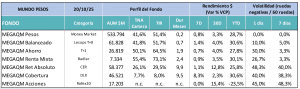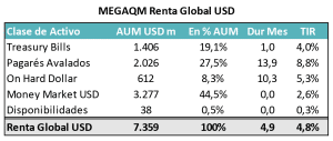 MEGAQM Liquidez USD: La venta de dólares en el mercado cambiario de parte del Tesoro Nacional y del Tesoro de Estados Unidos, ha derivad en un constante aumento de los depósitos de privados en dólares en el sistema financiero local. Esa mayor liquidez ha permitido a los bancos ir bajando la tasa que pagan por cuentas remuneradas y mantener casi sin presión el segmento de caución en dólares. Esta etapa del proceso electoral se da con fuerte liquidez en moneda extranjera y eso ha llevado a bajar un escalón el rendimiento de los money market puros como el MegaQM Liquidez USD. <Igualmente vemos atractivo en mantener este producto exclusivamente con activos a devengamiento y sin ningún tipo de riesgo de precio. Los inversores que alocan en estos instrumentos buscan esa estabilidad, aunque la cartera hoy esté en niveles de TIR de 1,7% y el rendimiento del VCP esté en niveles del 1,5%.