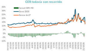 Otro de los movimientos significativos en esta semana post elecciones lo vemos en la curva CER, que necesariamente está comprimiendo hacia tasas reales más bajas. Es parte del arbitraje con la curva Hard Dollar y de la corrección de expectativas de tipo de cambio real. Ya no se espera una corrección de TCRM, por lo tanto hay nuevo punto de arbitraje.